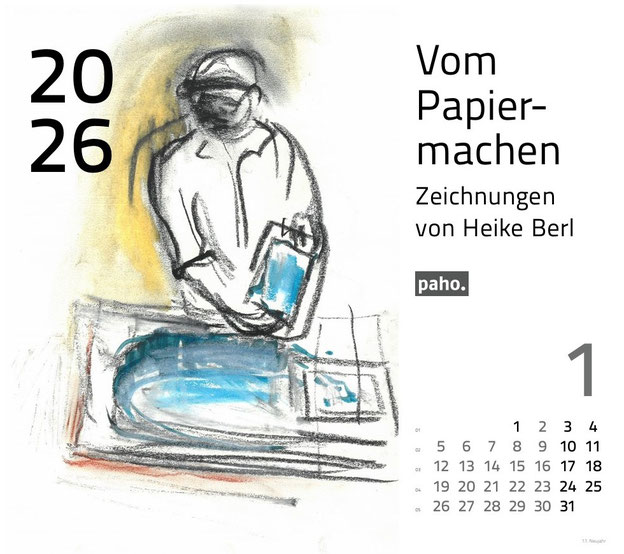 Der Kalender zeigt Eindrücke aus der Papierfabrik Homburg am Main von Heike Berl. Dort lässt sich der vorindustrielle Papierherstellungsprozess auf eindrucksvolle Weise nachvollziehen. Während ihres Walz-Stipendiums des Vereins für die schwarze Kunst konnte Heike Berl diesen und andere Orte kennenlernen, an denen die Traditionen des Buchdrucks und der Papierherstellung bewahrt werden. Neben den Zeichnungen von Heike Berl hat Ute Fürstenberg kurze Texte über das Papiermacherhandwerk verfasst.